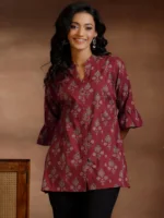 Our maroon printed cotton kurti features a mandarin notched neckline with three-quarter bell sleeves. Elevated with ethnic motifs print, this style is perfect for casual outings.