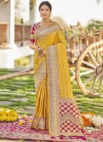 Adorn yourself in the epitome of elegance with this resplendent yellow saree exquisitely crafted to captivate hearts and turn heads. Crafted from luxurious art silk its vibrant yellow hue evokes a sense of joy and radiance perfect for any celebratory occasion. The saree is adorned with intricate Benarasi zari and jacquard work showcasing a harmonious blend of traditional craftsmanship and contemporary allure. The golden motifs delicately woven into the fabric add a touch of regal splendor elevating its allure to new heights. Contrasting the sunny yellow backdrop delicate pink accents grace the saree creating a captivating visual contrast that accentuates its beauty. The subtle yet striking floral and motif work in pink further enhances its charm adding depth and dimension to the ensemble. Completing the ensemble is a meticulously tailored blouse in matching pink customdesigned to complement the saree flawlessly. Embellished with coordinating floral and motif work the blouse adds a touch of sophistication and completes the look with finesse. Indulge in timeless elegance and exquisite craftsmanship with this breathtaking ensemble a true testament to the timeless allure of Indian traditional attire. Whether its a wedding festival or any special occasion this ensemble is sure to make you the epitome of grace and style.