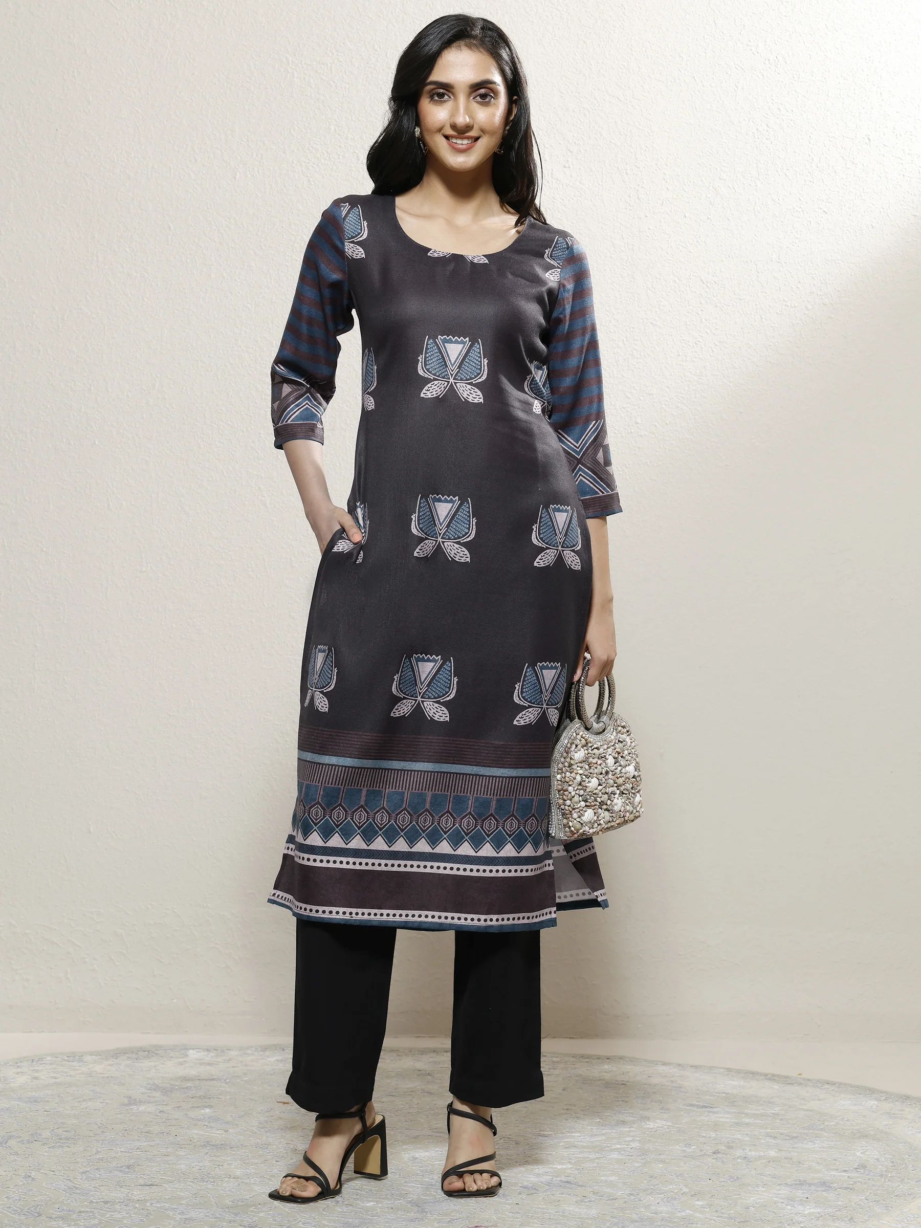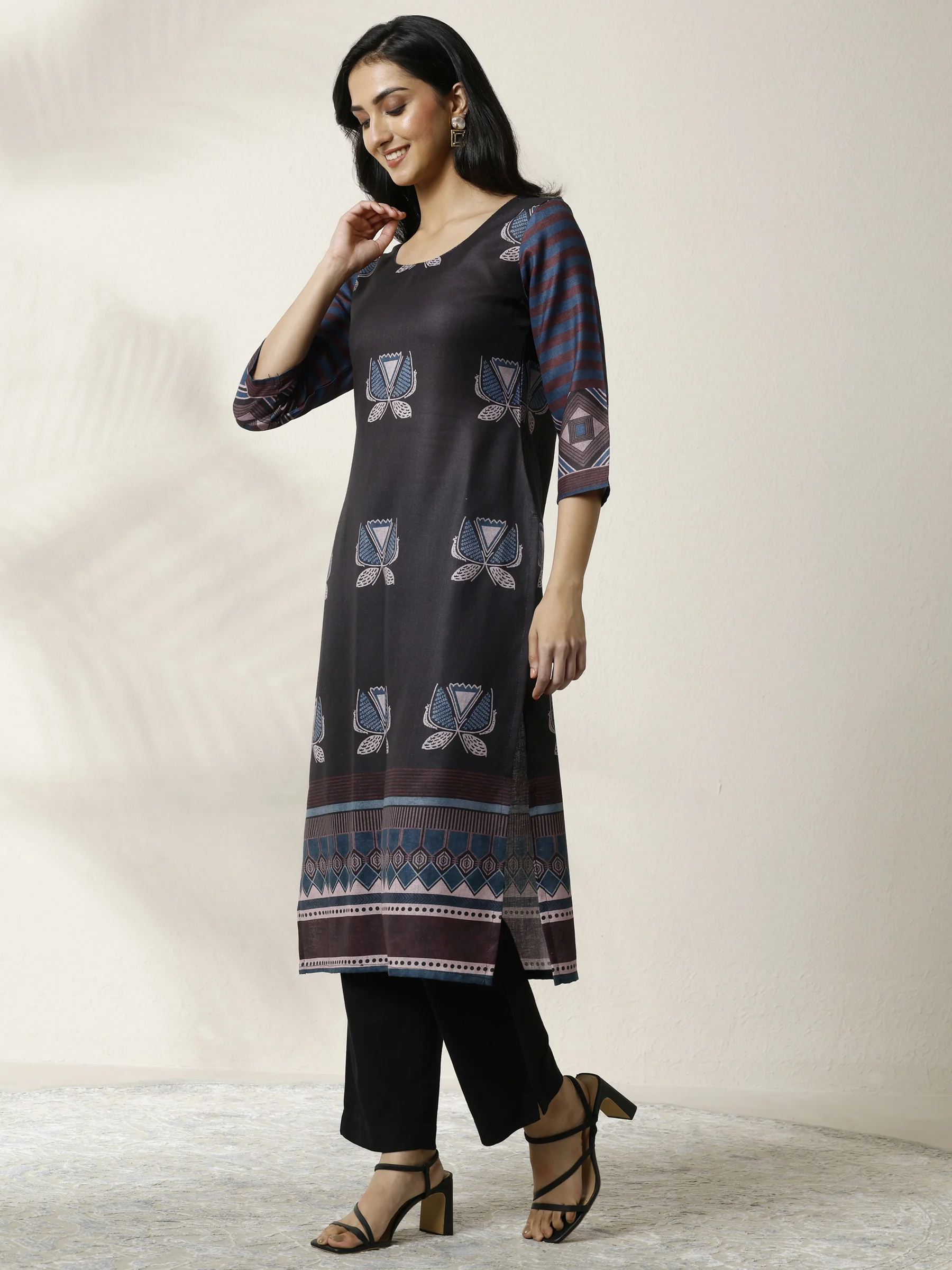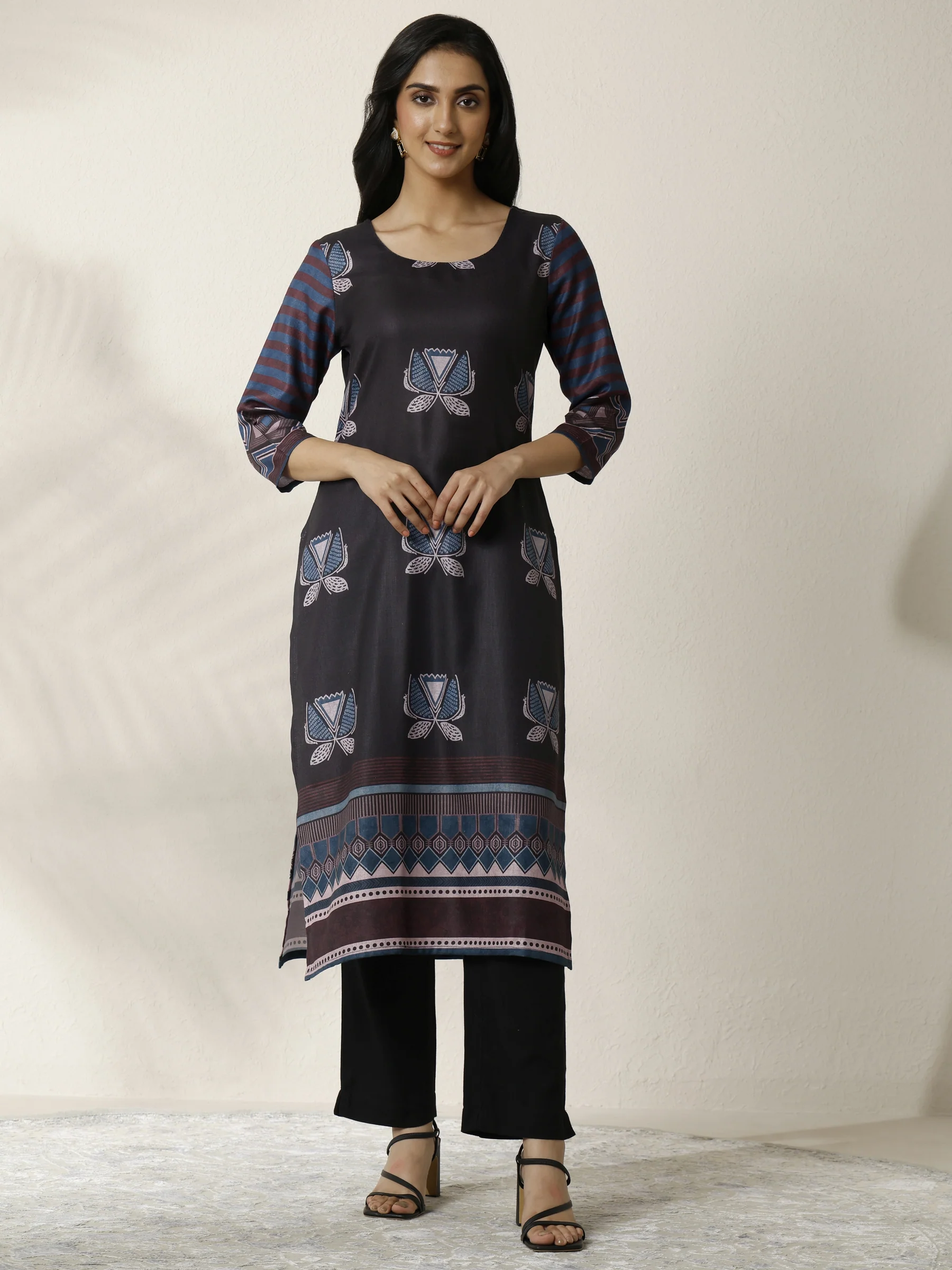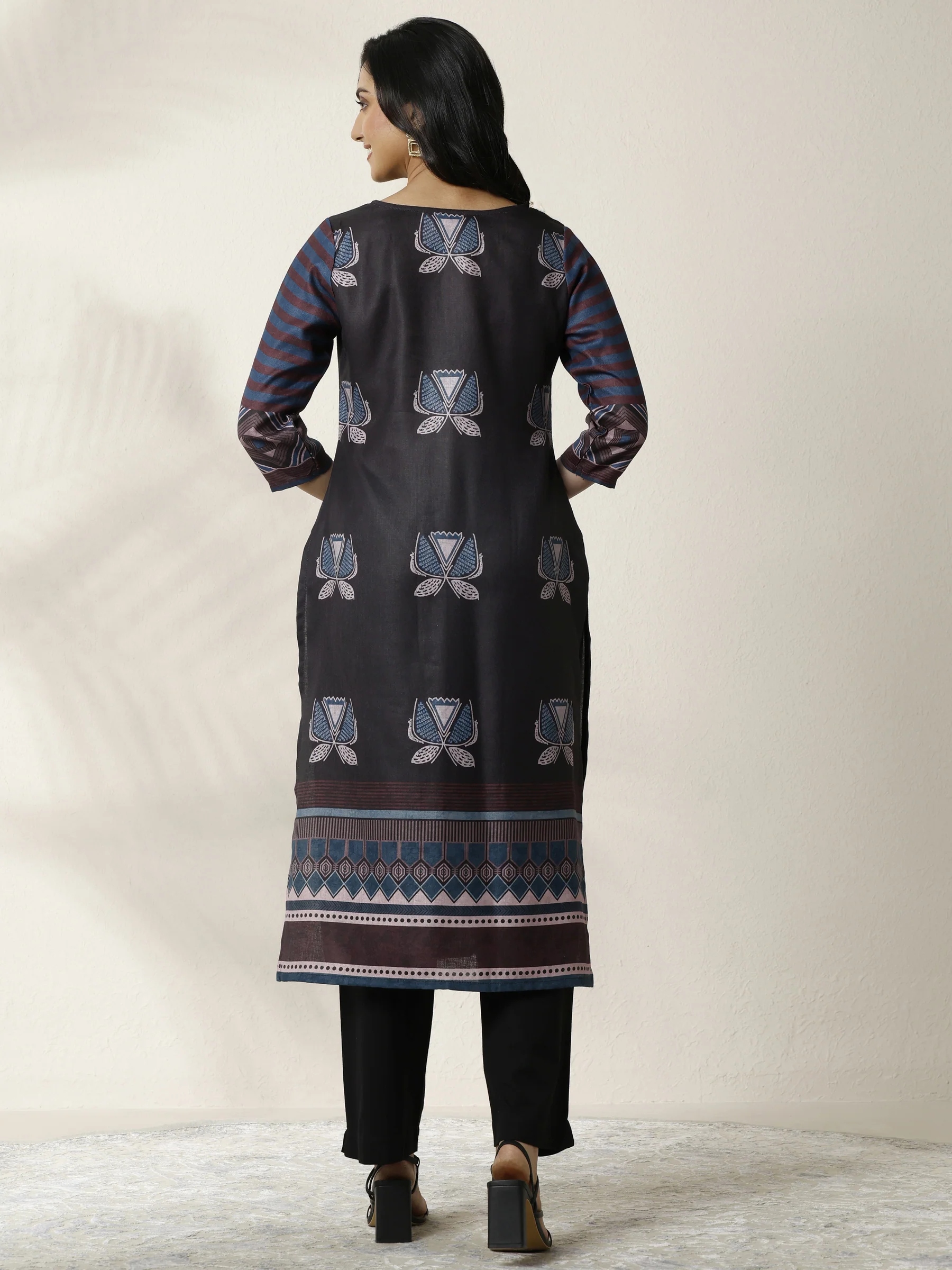 Home Kurtis Long Kurtis Black Printed Cotton Blend Straight Kurta