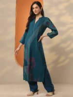 Blue Printed Silk Blend Straight Kurta