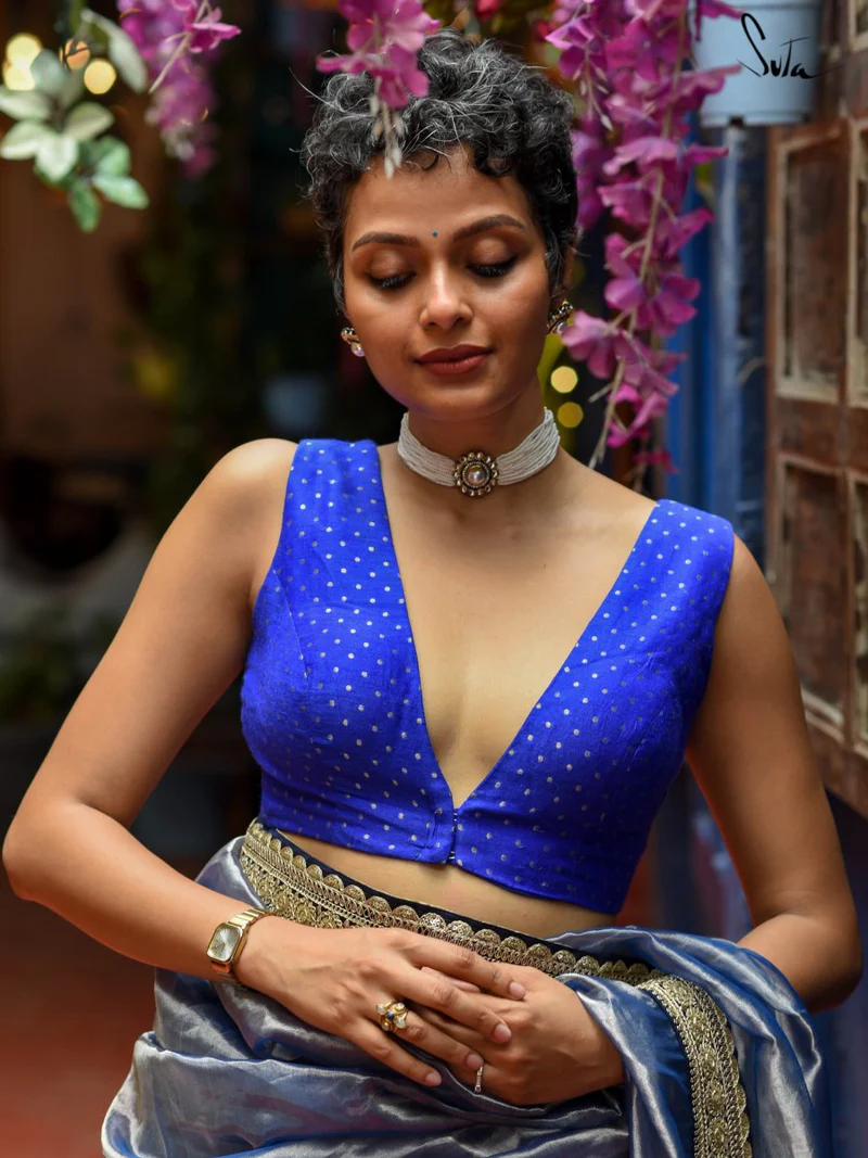 Blue Silk Sleeveless V Neck Benarasi Blouse