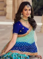 Real beauty can come out from your dressing style and trend in this sky blue and navy blue color viscose chanderi silk saree beautified with embroidered and zari work over the saree add a sign of beauty statement to your look. This saree comes with unstitched navy blue color banglori silk with embroidered work blouse.