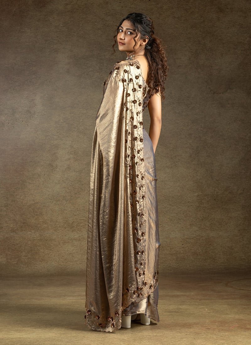 - Grey fendi satin silk saree is a contemporary statement piece designed to enhance your festive wardrobe with a unique shimmer and refined elegance. The fabric carries a textured sheen that drapes smoothly and creates a fluid silhouette. Highlighting its surface are detailed hand embroidered accents arranged across the pleats and pallu. These embellishments reflect traditional artistry in a very modern palette.