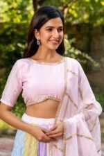 Featuring a multi-colored lehenga in a georgette base. It is paired with a pink embroidered blouse and an organza dupatta. Accentuate with chandbali earrings and heels for an engagement ceremony or a festive occasion.