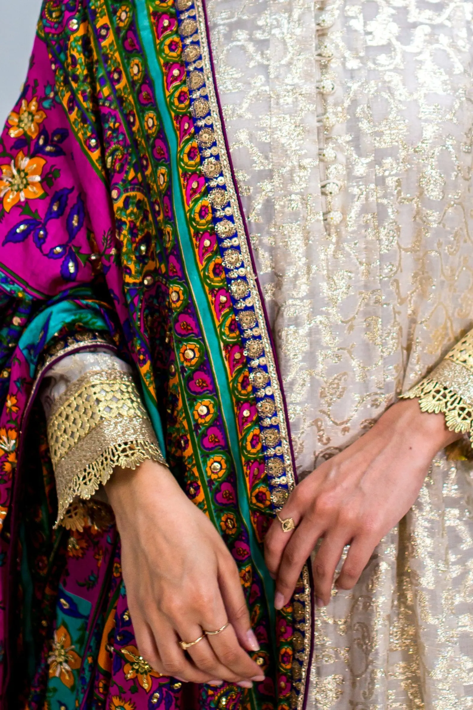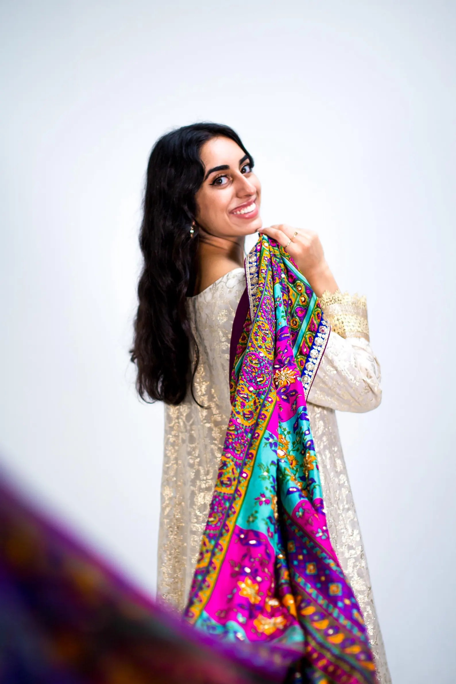 ✨ Turn every outfit into a statement with this luxurious multicolor silk dupatta, beautifully detailed with glass-shine sequins that sparkle with every movement. The vibrant patchwork-inspired print, paired with intricate embellishments, makes it a standout piece for any festive occasion.