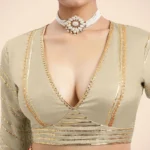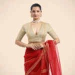 Navya x Tyohaar | Cream Elbow Sleeves FlexiFi Saree Blouse with Plunging V Neckline with Tasteful Golden Gota Lace