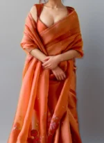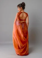 • The orange silk blouse perfectly complements the saree offering a rich textural contrast to the airy organza. Made from high quality silk the blouse can be customized according to individual style preferences ensuring a flattering fit and personalized design. Whether you opt for a traditional cut or a modern silhouette the blouse promises to enhance the overall look of the ensemble. The minimalistic embellishments on the blouse echo the delicate detailing on the saree tying the entire outfit together seamlessly and creating a polished harmonious appeal.