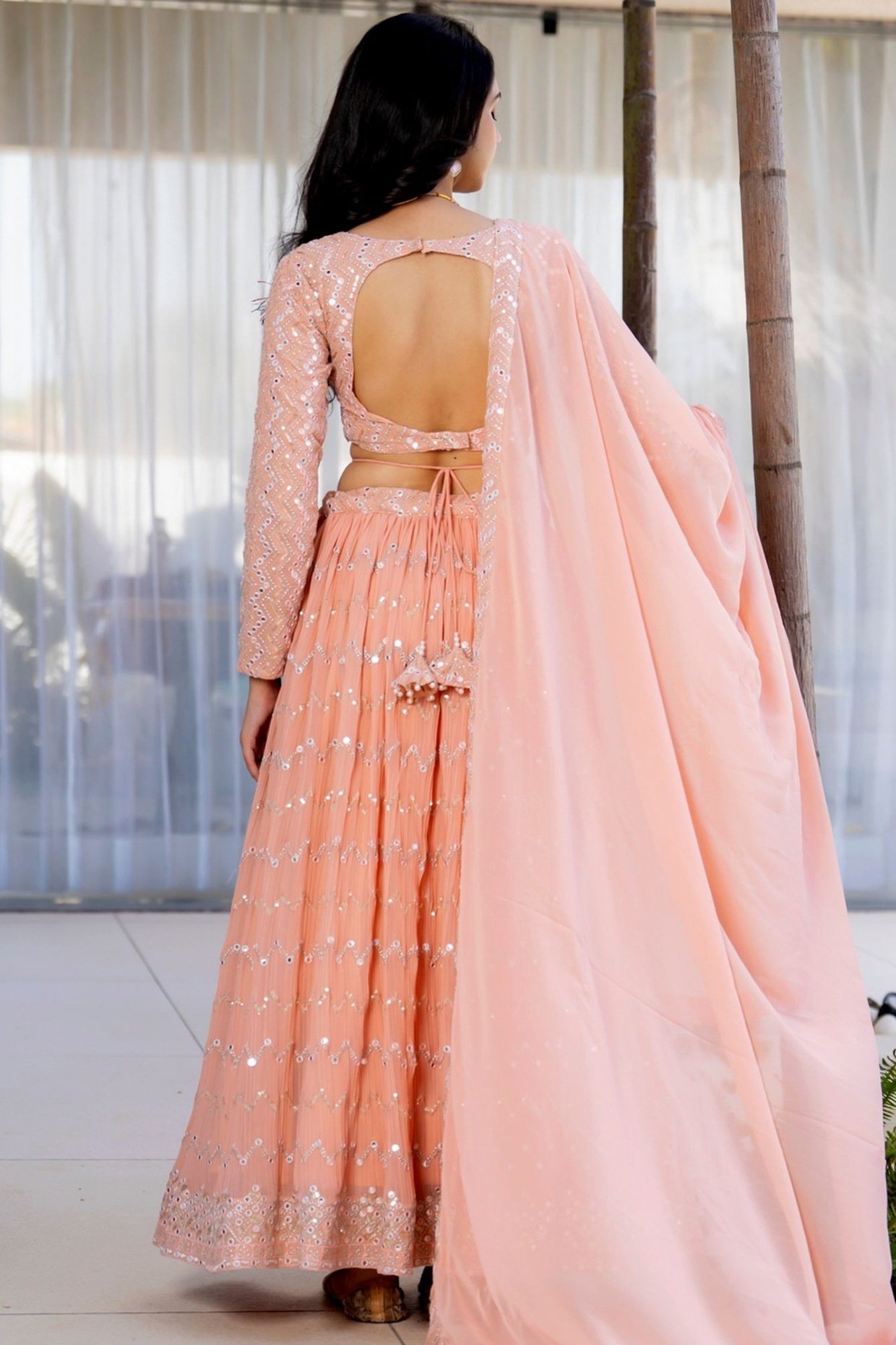 Featuring a peach lehenga in georgette base with latkans and mirror work. It is paired with a blouse and a dupatta. Accentuate it with dangler earrings and heels for festive occasions or wedding ceremonies.