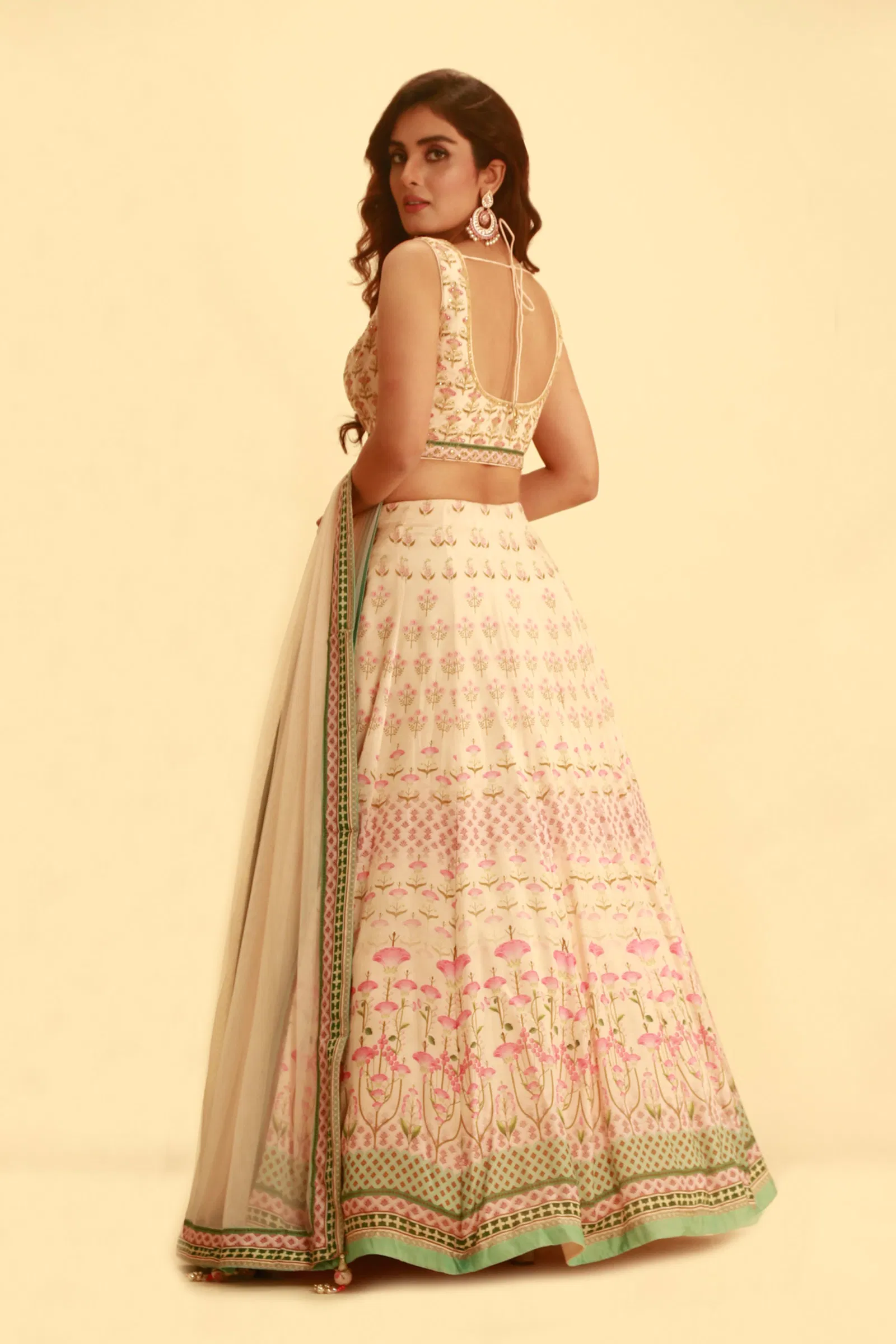 - Description: Indulge in the understated elegance of this pearled ivory white lehenga, adorned with bel buti patterns and rhinestone work. Pair it with pearl accessories for an ethereal, vintage appeal.