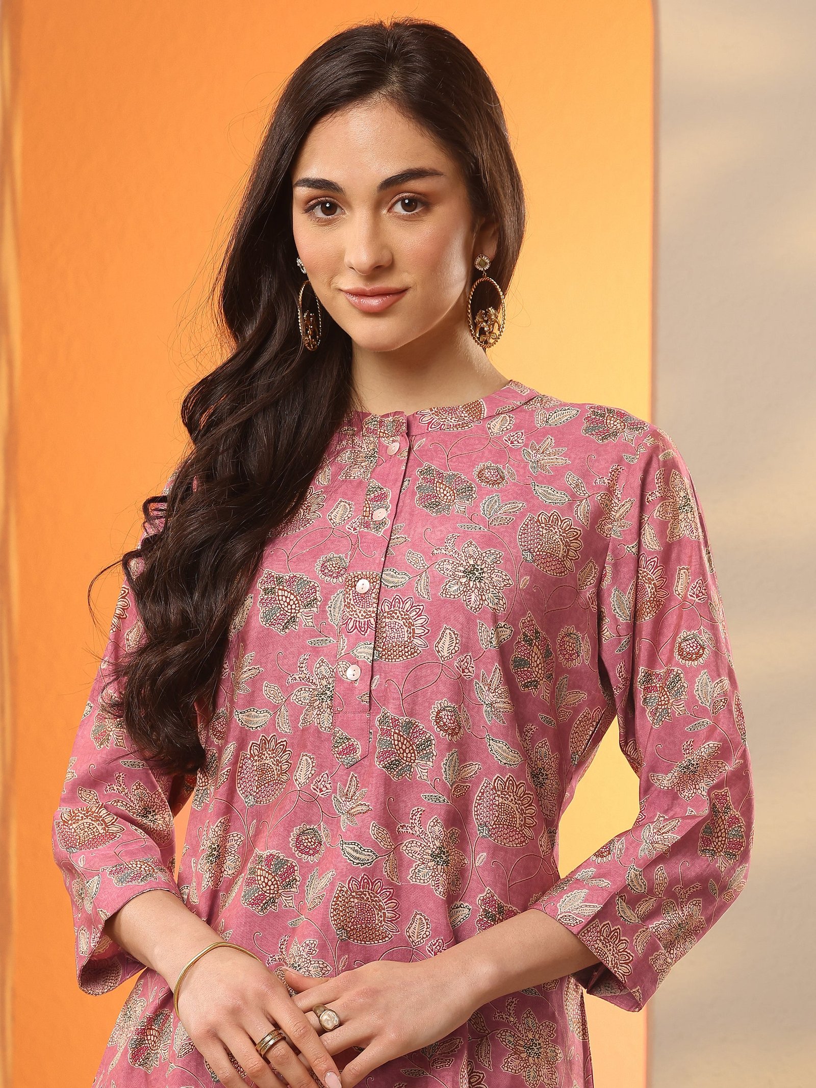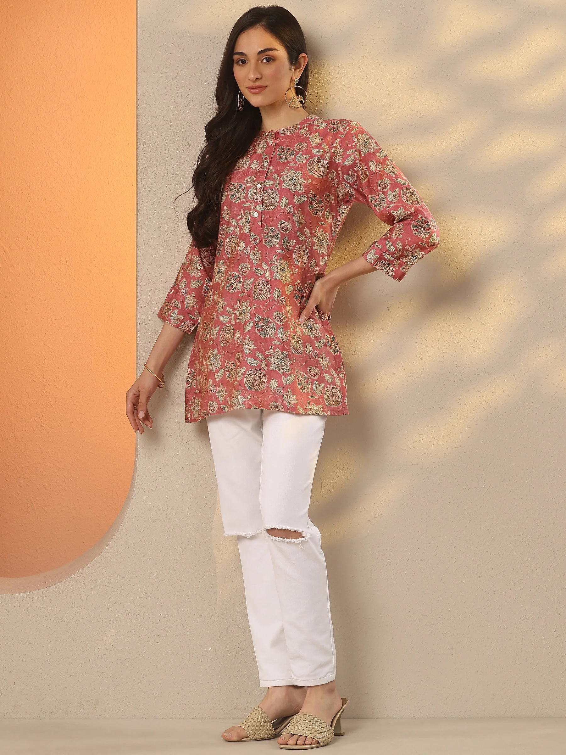 Pink Printed Silk Blend Straight Short Kurti
