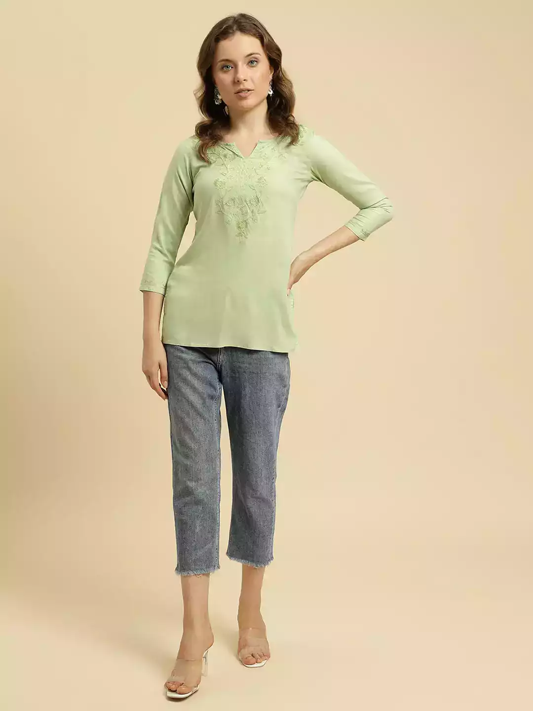 Home Kurtis Short Kurtis Pista Green Kashmiri Silk Work Short Kurti