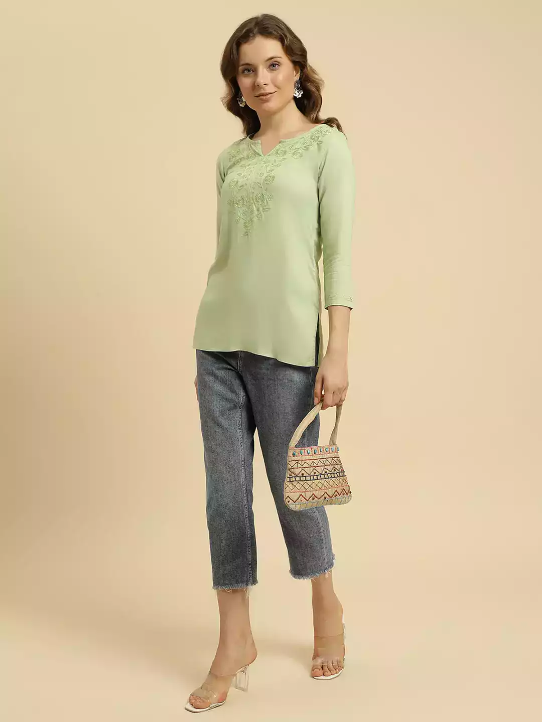 Pista Green Kashmiri Silk Work Short Kurti