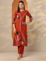 Rust Printed Silk Blend Straight Kurta
