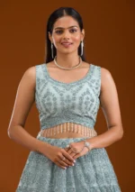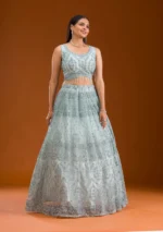 Unleash your vibrant side with mint green lehenga, a masterpiece in net fabric adorned with meticulous stonework. This lehenga blends the freshness of mint with the sparkle of delicately placed stones, creating a spectacle of light and fabric. It’s not just attire, it’s a statement—where traditional craftsmanship meets contemporary charm in an ensemble that’s as alive and effervescent as you are!.